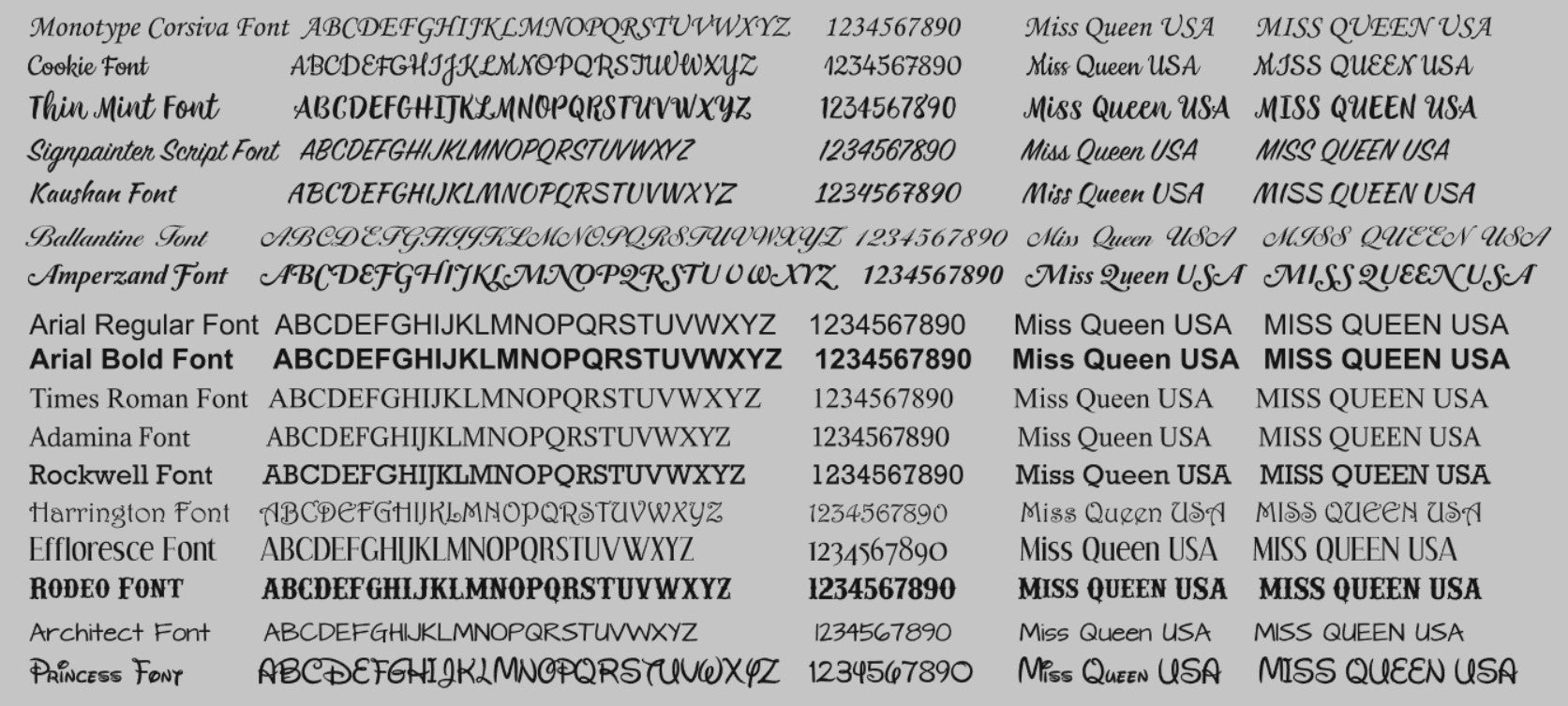 Our Font Chart is available by CLICKING HERE to open up a new window
